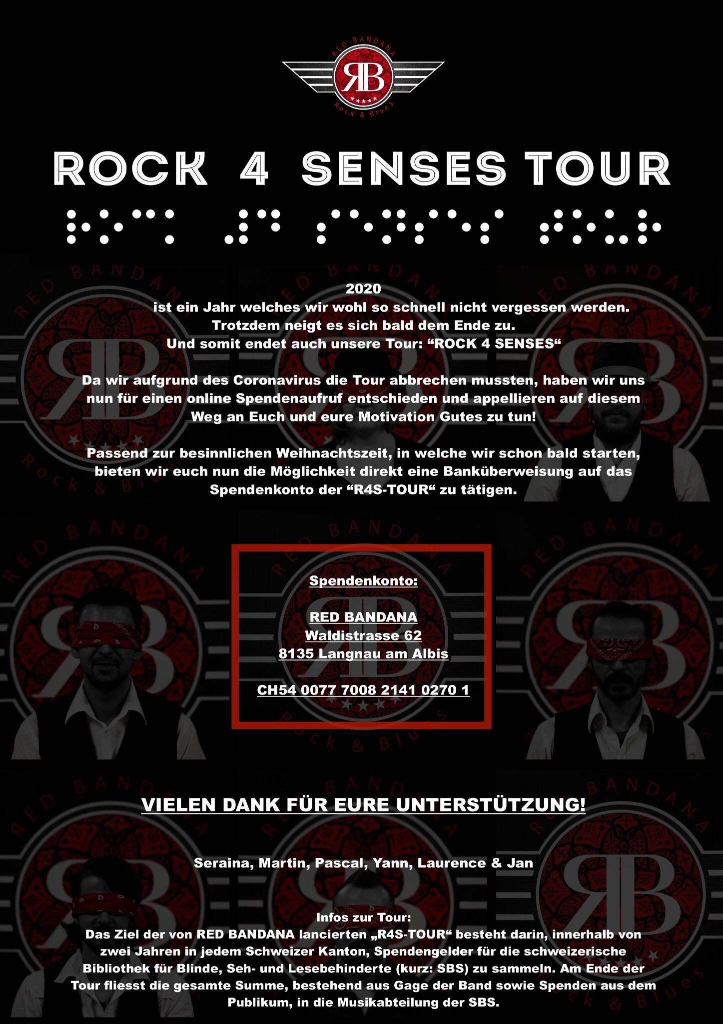 Das Ziel der von RED BANDANA lancierten „R4S-TOUR“ besteht darin, innerhalb von zwei Jahren in jedem Schweizer Kanton, Spendengelder für die schweizerische Bibliothek für Blinde, Seh- und Lesebehinderte (kurz: SBS) zu sammeln. Am Ende der Tour fliesst die gesamte Summe, bestehend aus Gage der Band sowie Spenden aus dem Publikum, in die Musikabteilung der SBS.